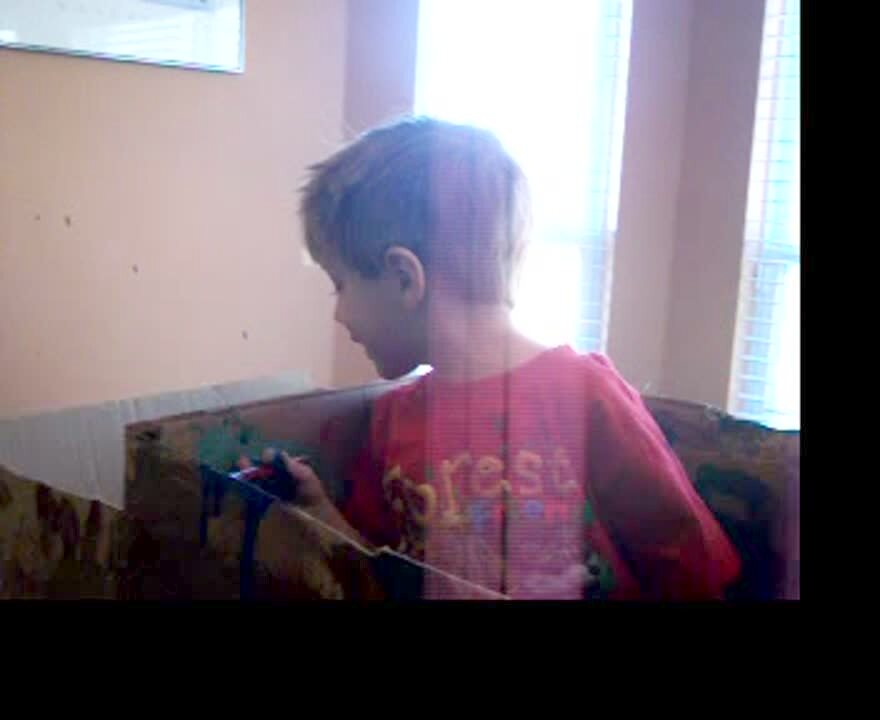 Tot girl has blue paint covering her face, & young boy says he painted her because she was painting in front of him. Mess.