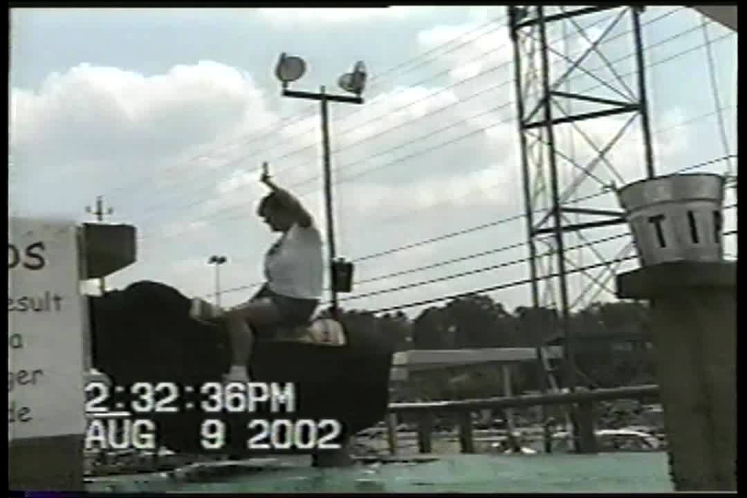 Woman riding mechanical bull gets thrown off as she tries to get on.