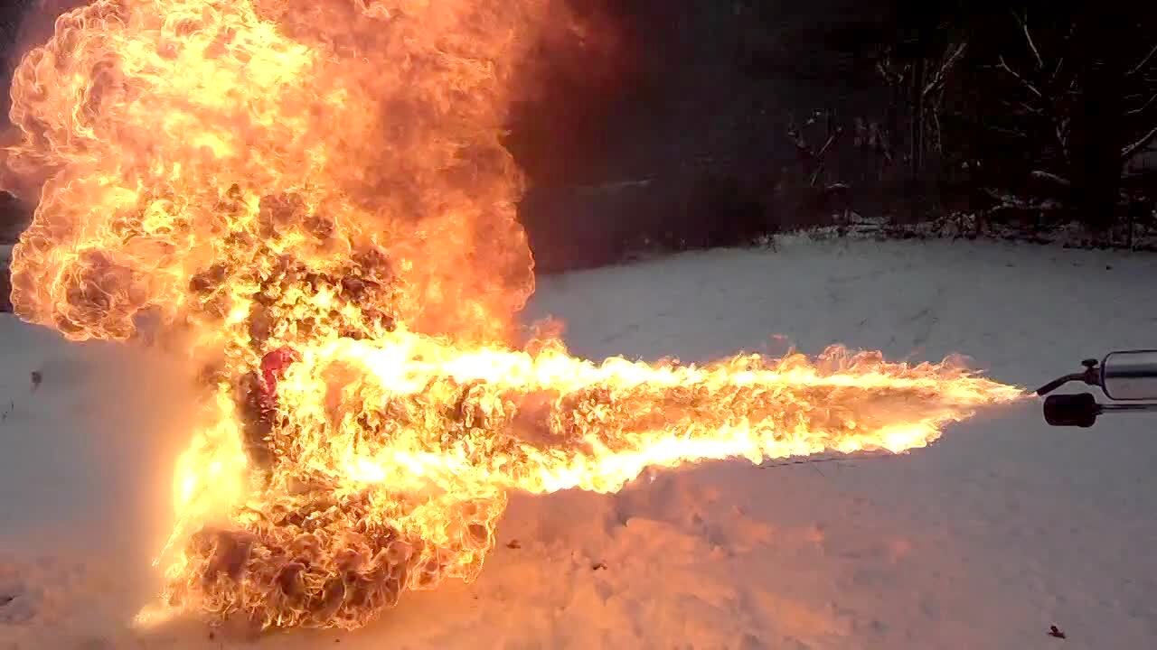 A man lights a fire under a snowman to destroy it. The snowman slowly gets a little thinner but doesn't melt. AA: Destroy a Snowman