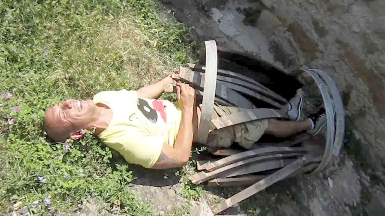Several office workers take turns repeatedly hitting a copier with a hammer outdoors while yelling until the toner explodes at 1:46.