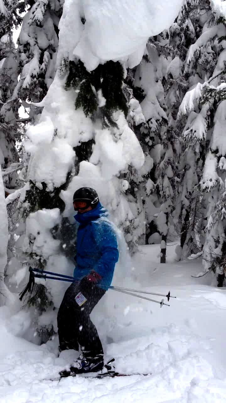 A man in ski clothing shakes a snow-covered tree outdoors and a large pile of snow falls down on him, burying him.