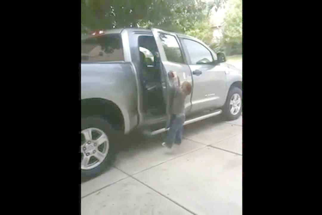 A teenage boy scares his dad while he drives a car. The man snaps at the boy and calls him a butt head. Short tail.