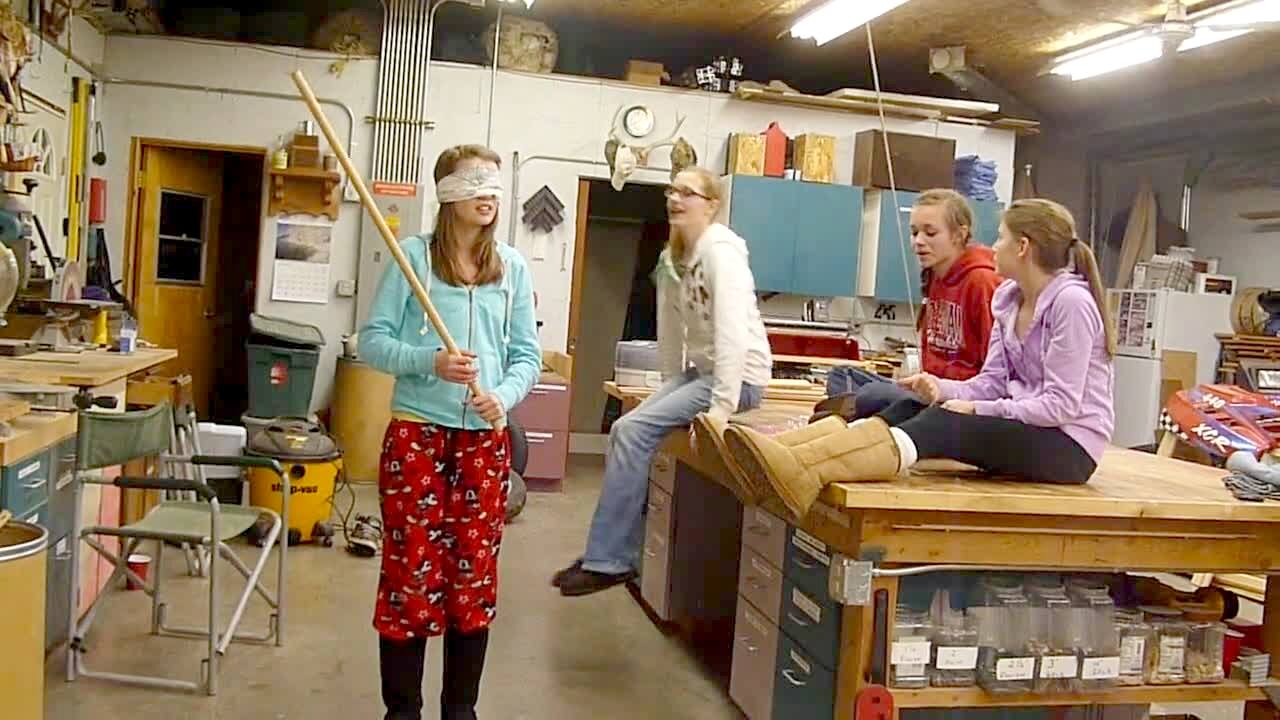 A teen girl hits another teen girl in the knee with a wooden pole while she tries to hit a pinata with a blindfold on.