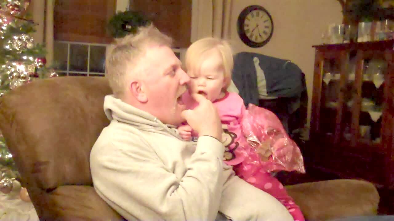 Tot girl on dad's lap opens her mouth and licks her lips while Dad (grandpa?) slowly feeds himself fudge with his finger. He has her finger right by her face so she thinks he is going to feed it to her. Cute.