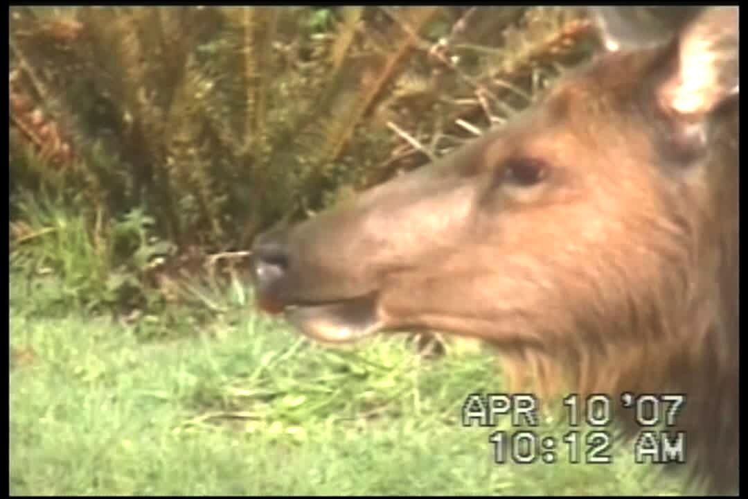 Elk is grazing in man's front yard & finds an Easter egg that the kids didn't find. Cow bites the egg open & eats the candy inside.