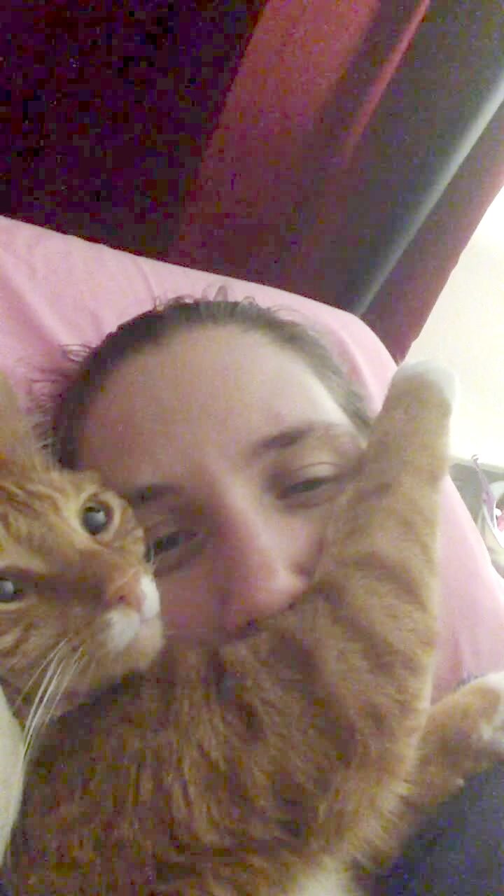 A woman sings badly and her cat sticks its head in the woman's mouth indoors.