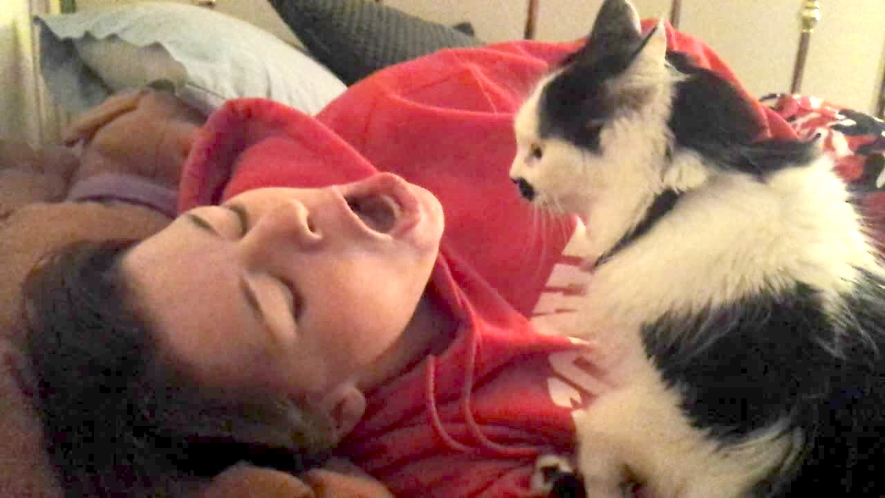 A girl in a sleeping bag screams and hisses at a kitten cat that jumps on her face.