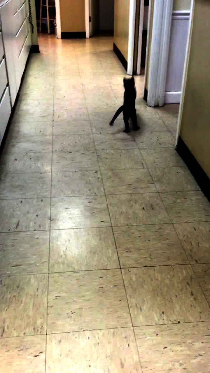 A kitten cat chases a ping pong ball down a hallway and jumps each time the ball bounces.