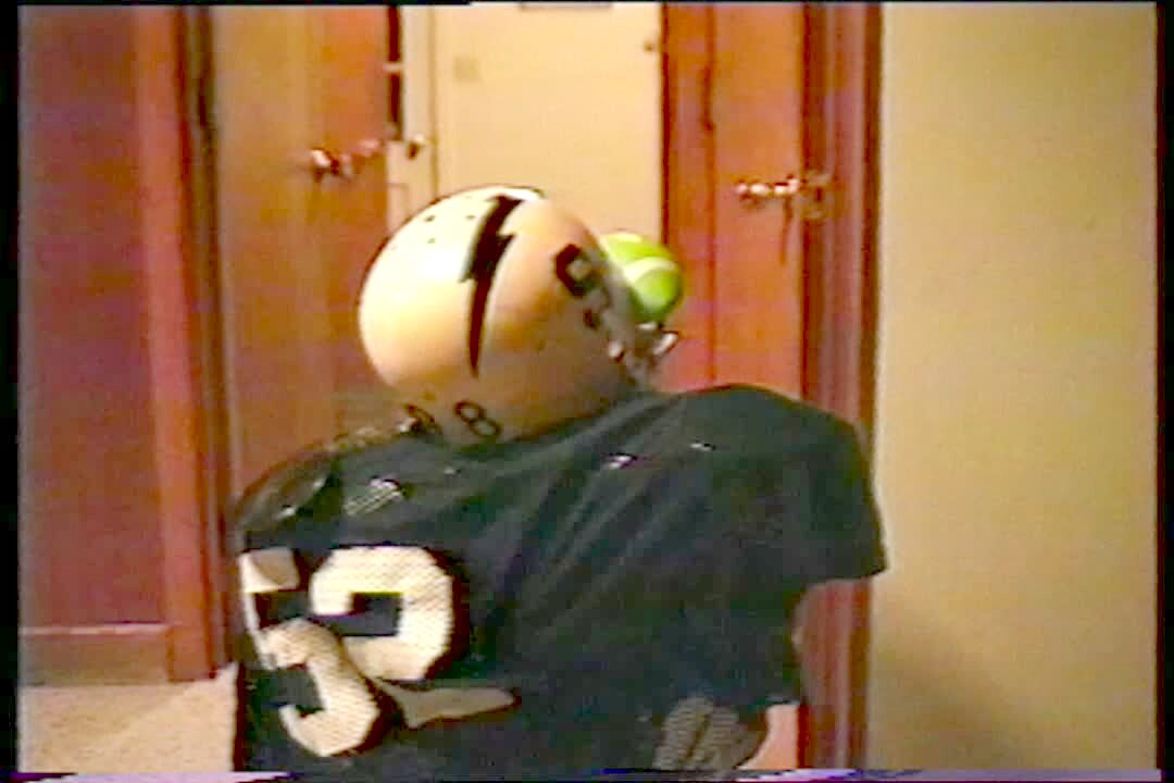 FACEGUARD FOOTBALL KID 2 boys play football, small ball gets ball stuck in kid's face mask.