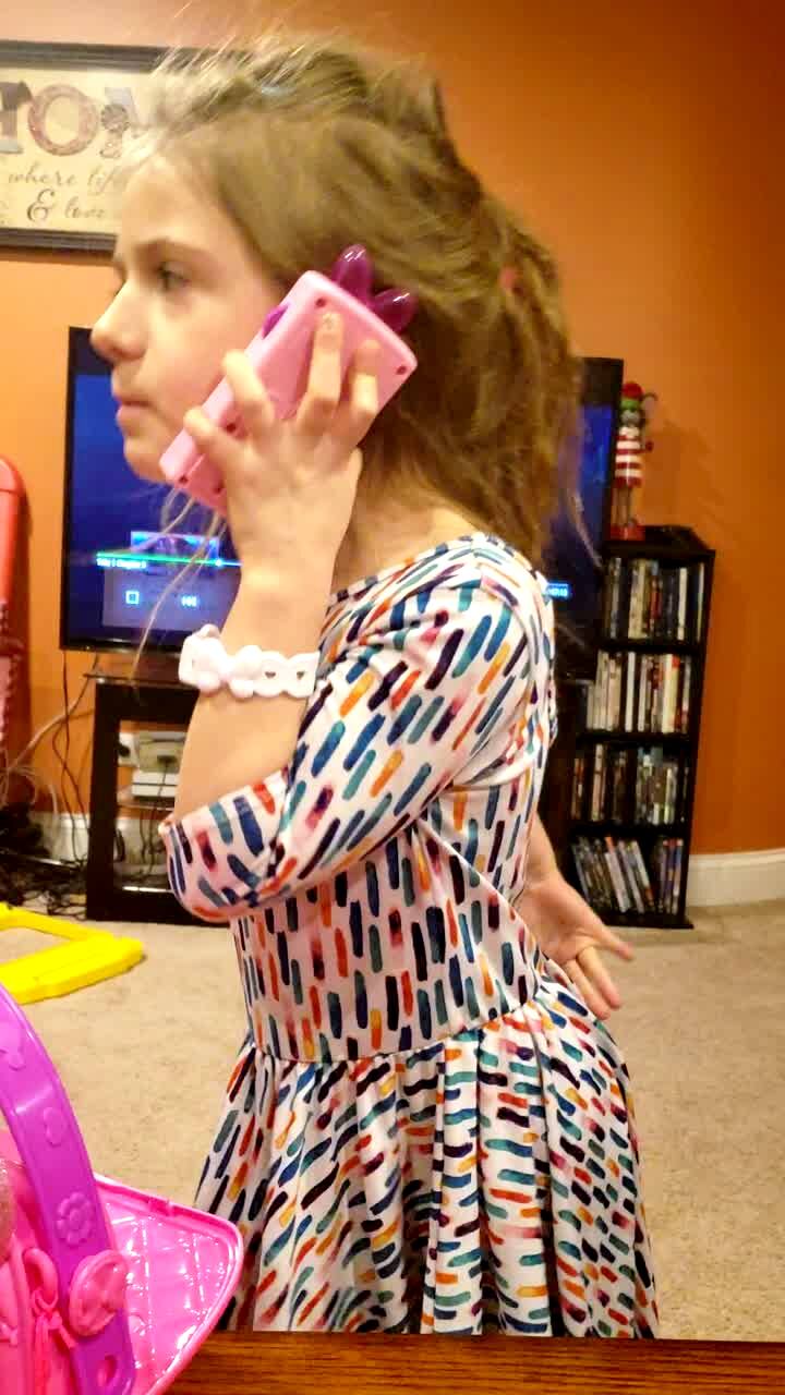 A young girl pretends to talk on a toy phone and says, "I told you to keep an eye on the children" then she hangs up and says that her husband didn't keep an eye on the children.