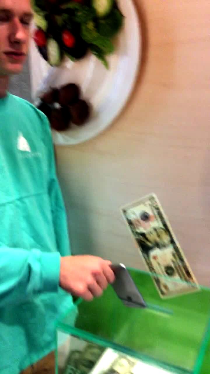 A teen boy drops his cell phone into a money donation bin accidentally.