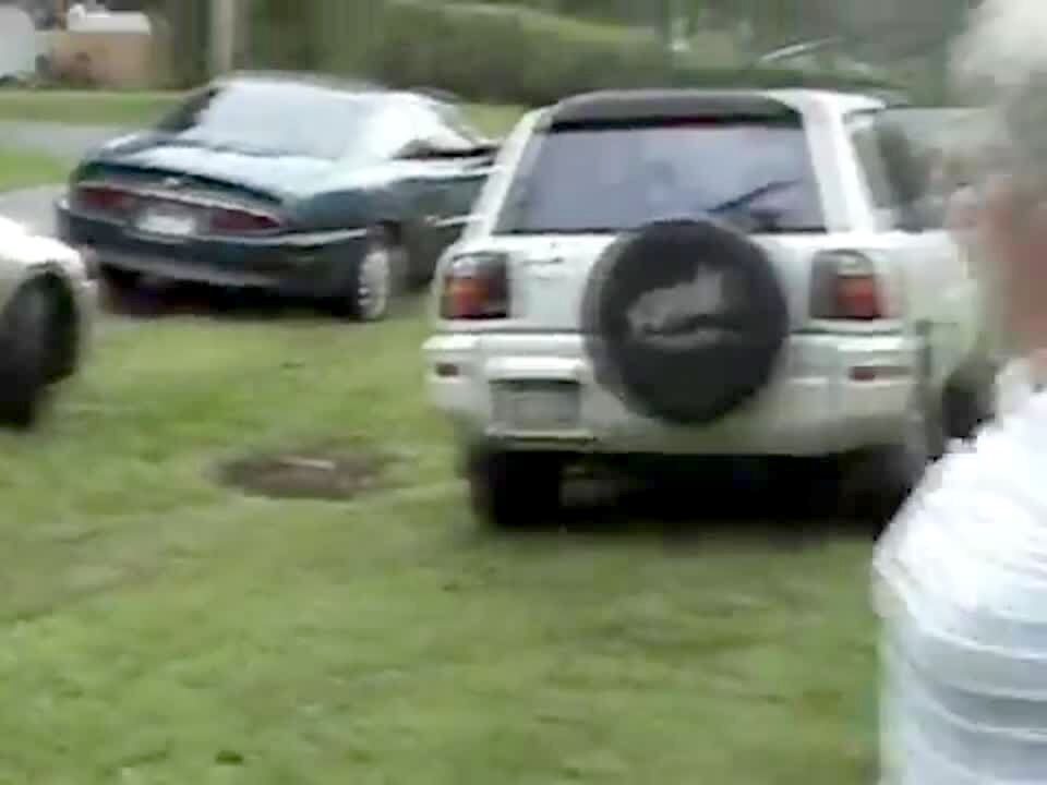 2 cheerleaders practice in backyard, 1 girl squeals, jumps up & runs away. She stepped in dog poop on grass.
