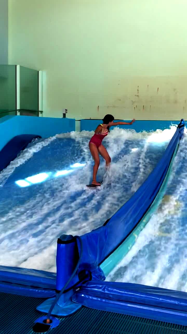 A teen girl surfs on an indoor wave pool surf machine. She steps off, excited, then falls and the water pulls her up a hill.