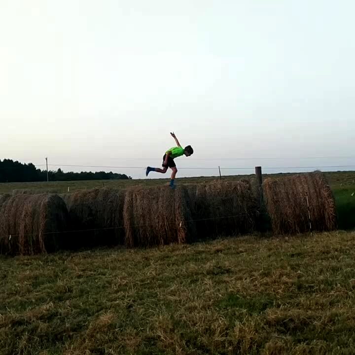 A young boy jumps over hay bales and face plants into one.