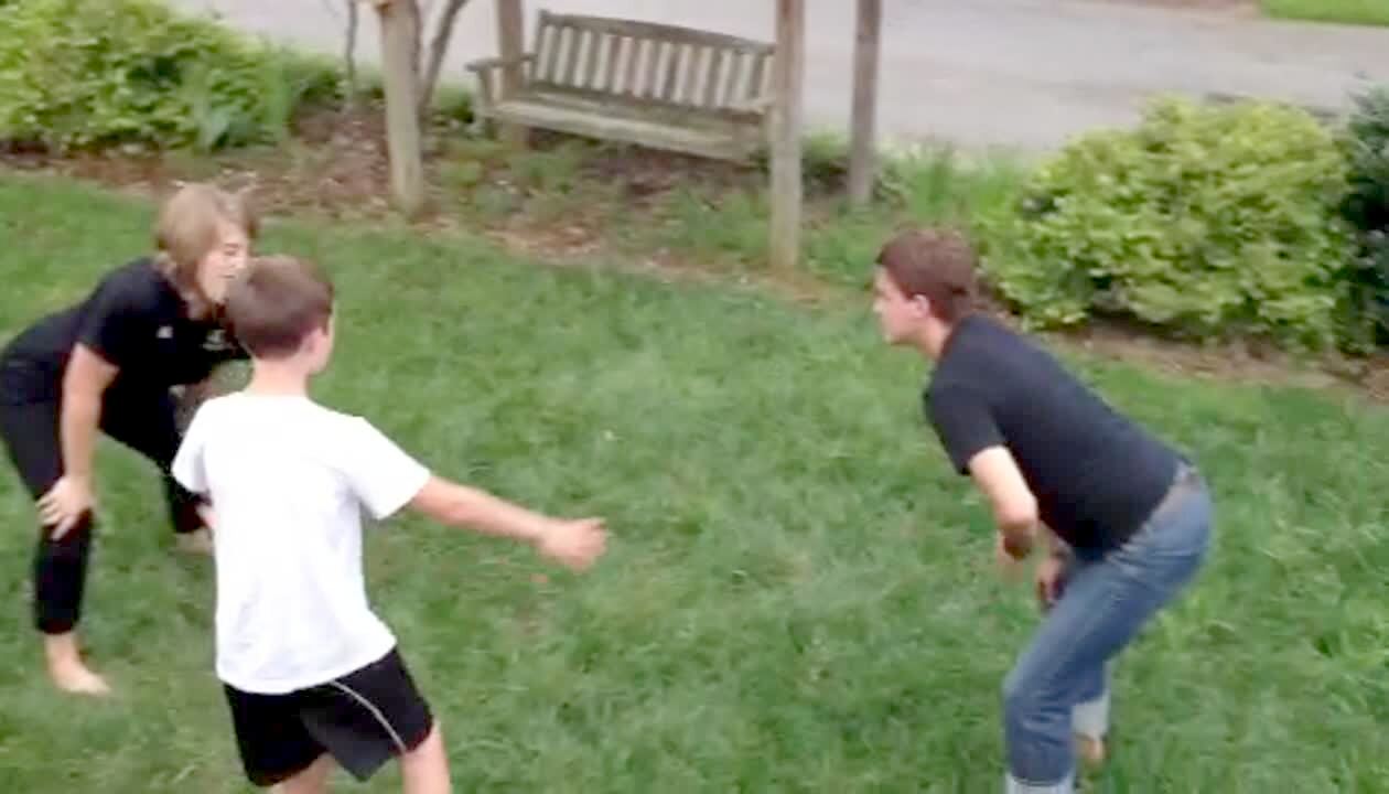 At 0:15, two teens who are spinning in circles outside knock heads.