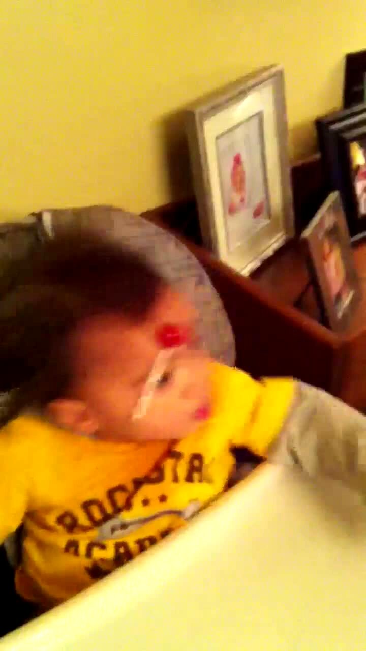A boy tot sits in a high chair indoors looking for the lollipop stuck to his forehead. The man behind the camera helps him get it.