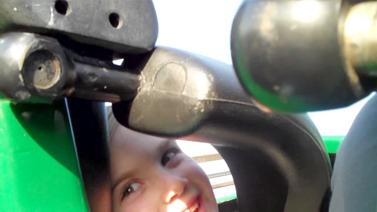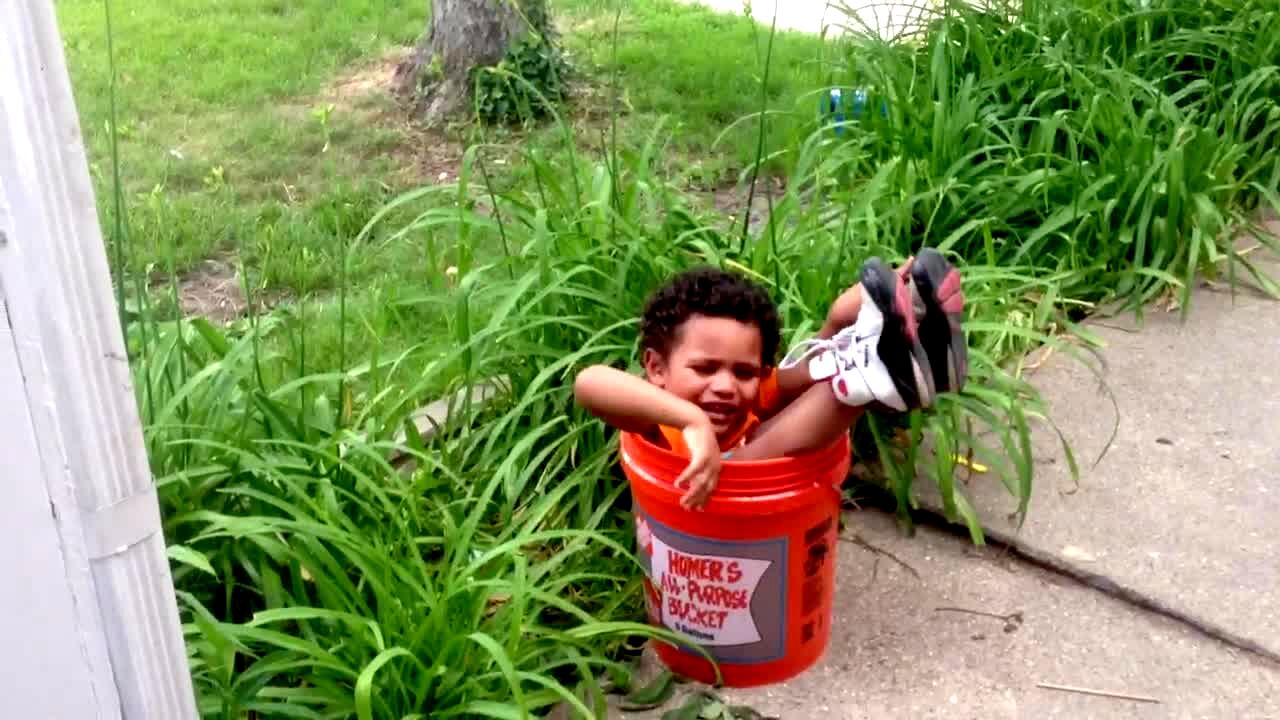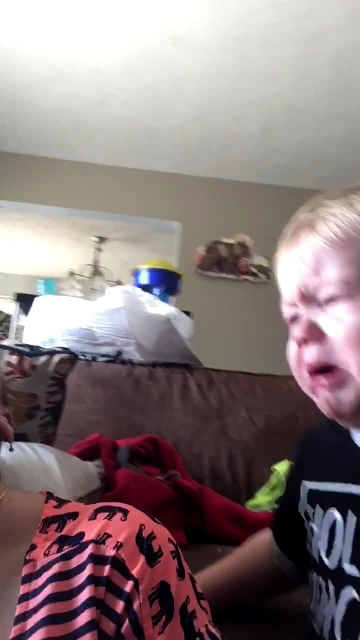 "Crash and Slow Burn" (RS) - boy wearing helmet crashed off toy wagon, dad (off camera) laughs, boy screams "It's not funny!"