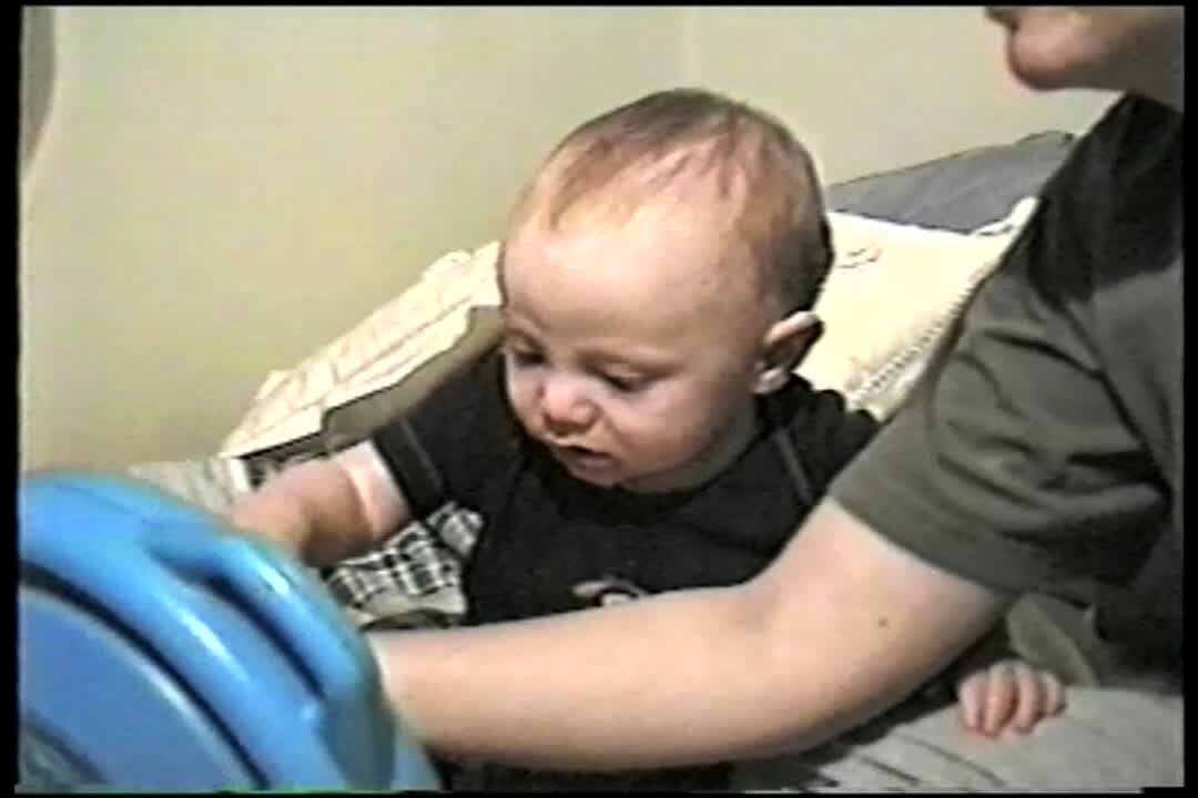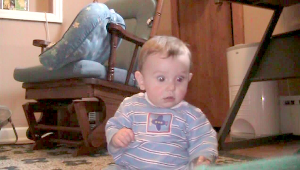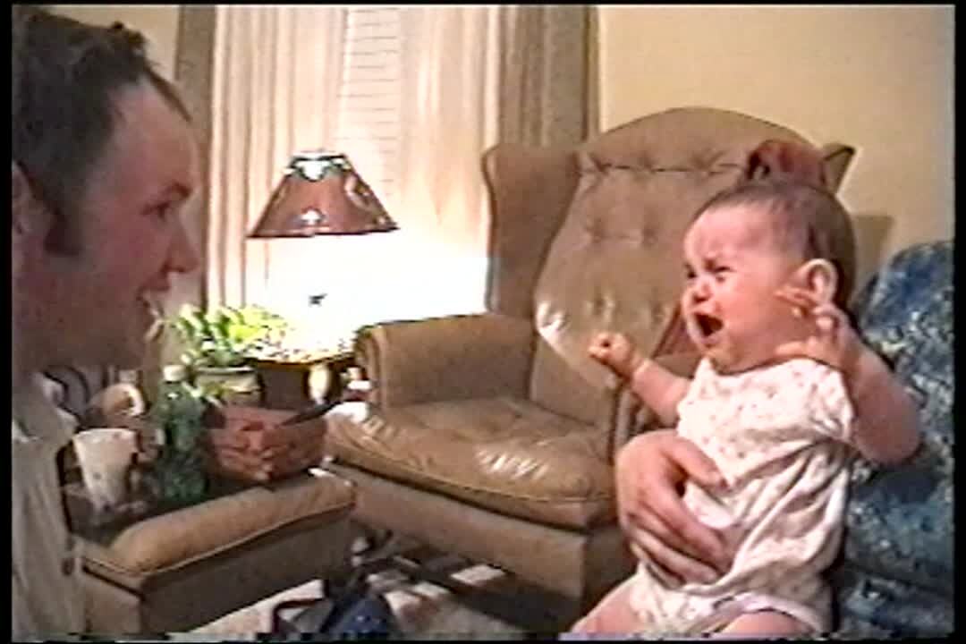Baby boy in green seat cries immediately when mom makes a "moo" sound to him.