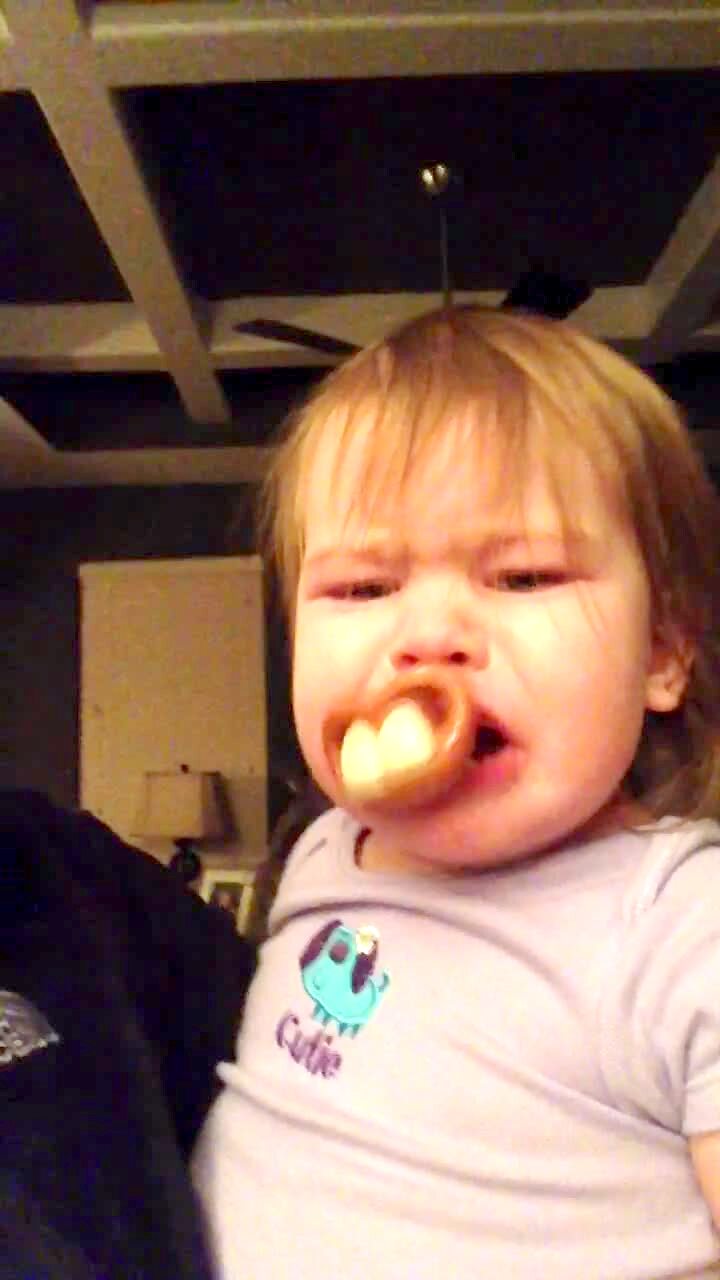 "Beaver Teeth Baby" A baby cries with a buck-teeth pacifier but her teeth chatter, causing the buck-teeth to wiggle up and down as she cries.