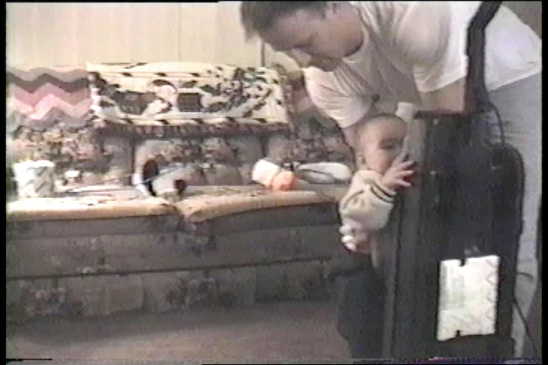 Dad holds baby girl, kisses her, she starts bawling. He calms her down, kisses her again, she cries again.