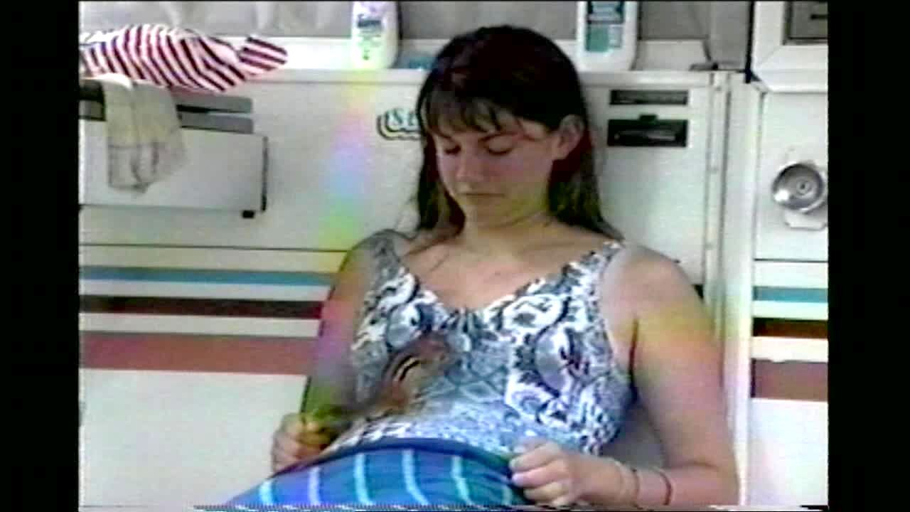 A man stands on a porch swing to look at a bird's nest, then he falls off of the swing. Security footage.