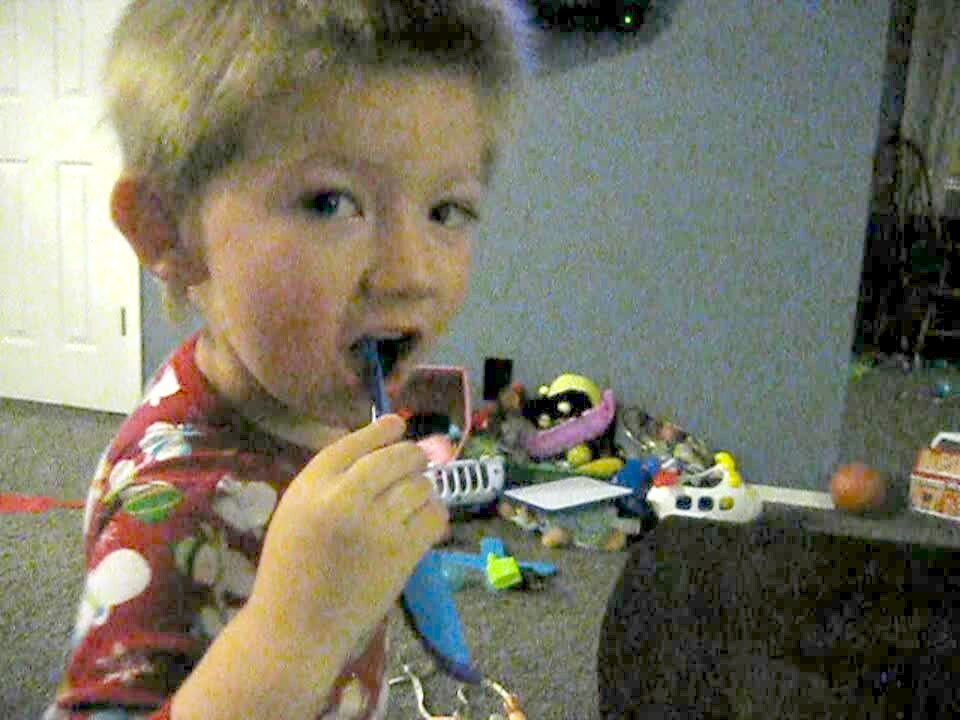 A three year old boy is brushing his teeth. Mom tells him to brush the back of his teeth and he starts brushing his back.
