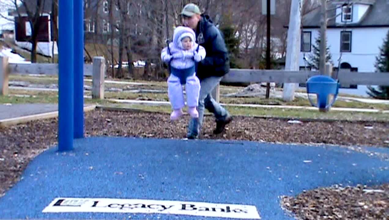 Dad pushes tot girl on a swing, loses his balance and falls down. Playground, park.