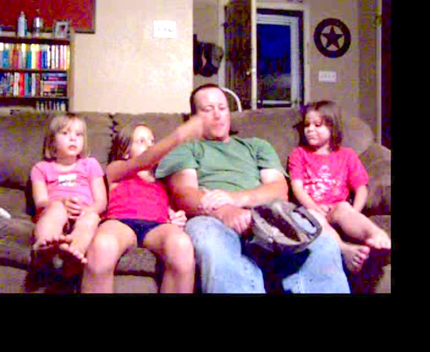 Giant remote control spider crawls out from under the TV in the living room and scares young boy. Dad is controlling it. Practical joke.