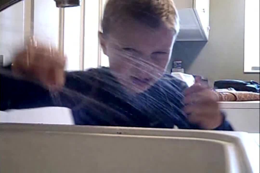 Dad sets it up to spray his 8 year old boy. Sink faucet. Prank / practical joke