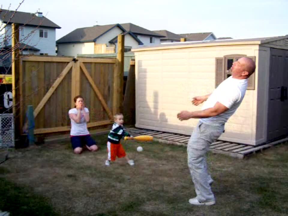 Man plays baseball with tot boy who hits the plastic ball right at his dad's head