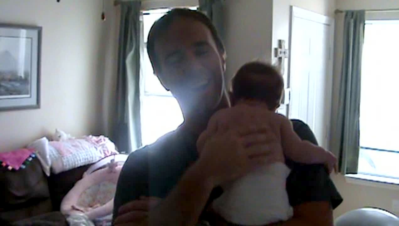 Dad holds baby girl, kisses her, she starts bawling. He calms her down, kisses her again, she cries again.