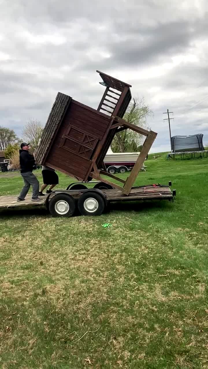 Two men on a trailer tip a playhouse over but it tips too far and falls off the trailer and it falls and breaks in a yard.