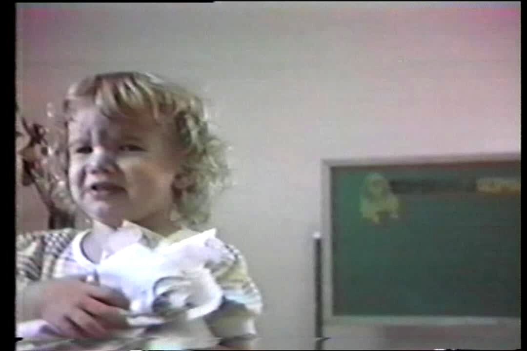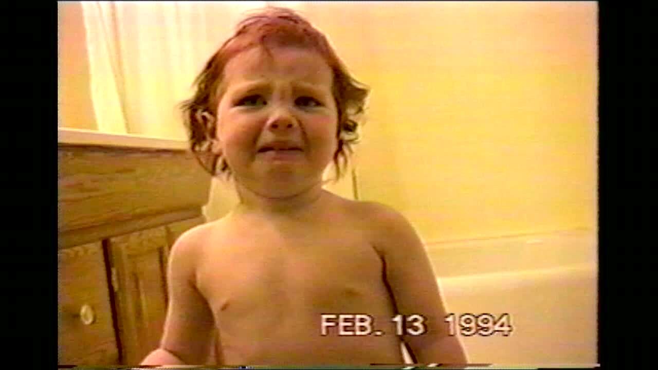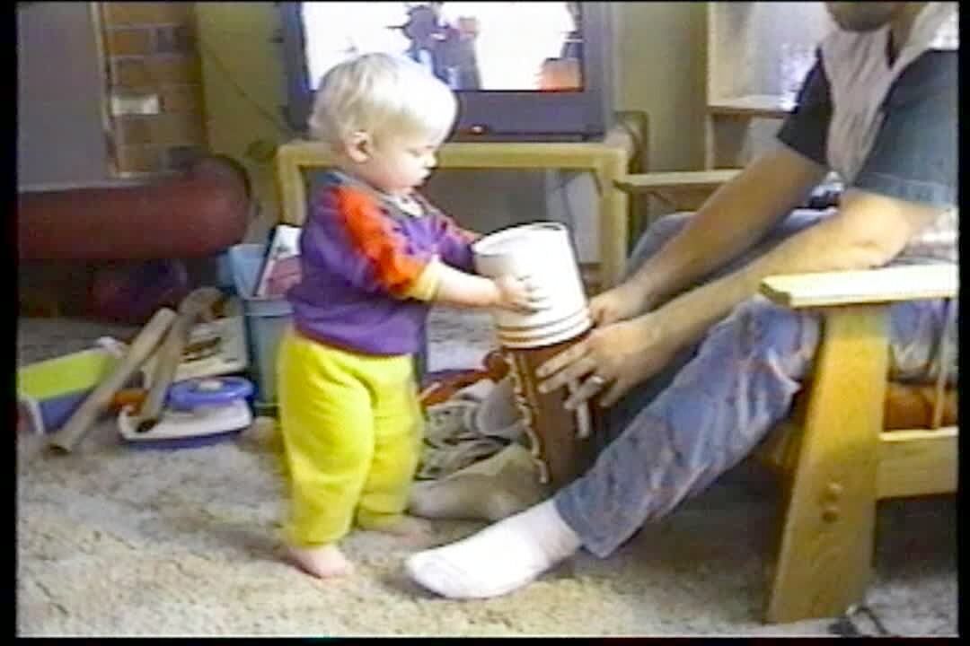 Tot hits head with lid that pops off 2x.