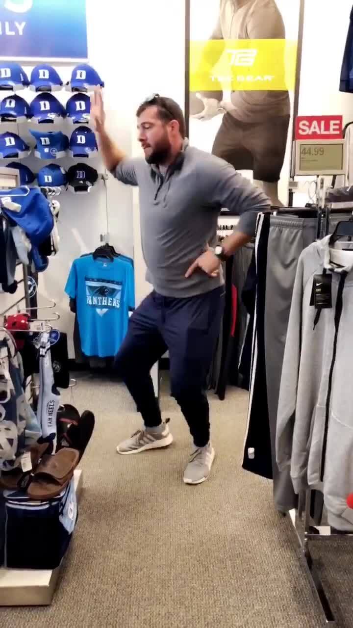 A teen girl dances with a scarf around her head. In the background a man stands on a step stool and gets hit by a moving ceiling fan. Music rights not cleared.