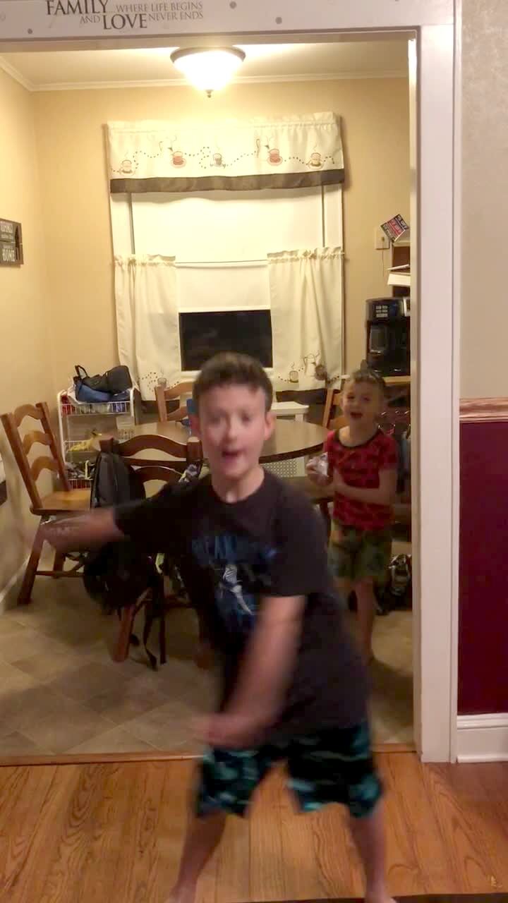 A young boy spills his graham crackers on the floor while he waves his arms as he tries to copy his young brother when he does the floss dance.