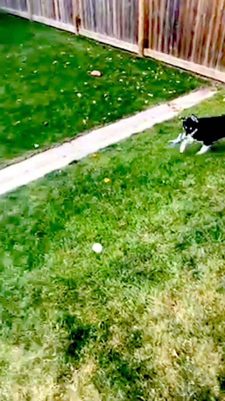 A woman chases her Husky dog in the yard when it runs away from her with scissors. She gives the dog a cookie and grabs the scissors from it.