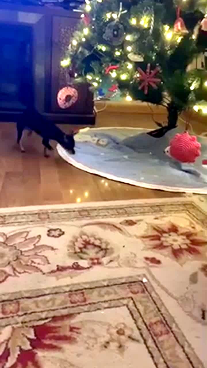 A cat watches a singing Christmas tree decoration and meows at it. The cat touches the tree and it starts singing again, and the cat jumps back and almost falls off of the table they are sitting on.