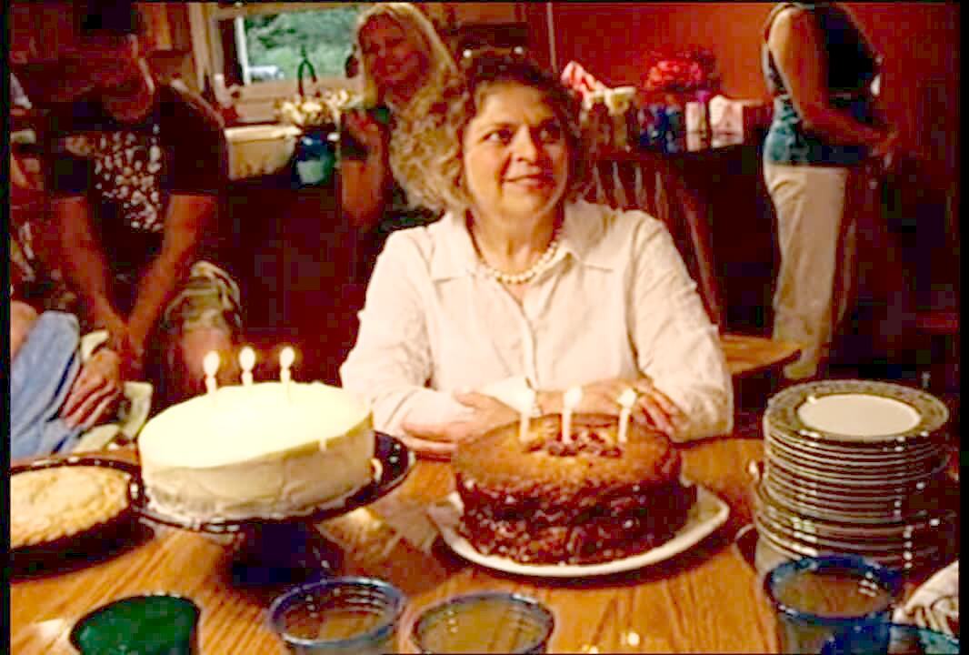 Teen boy puts a pie in grandma / senior woman's face at her 60th birthday party.