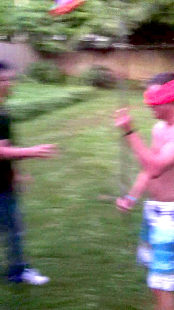 While blindfolded and swinging at pinata, shirtless man get slapped with cake at :38 and amuses friends.