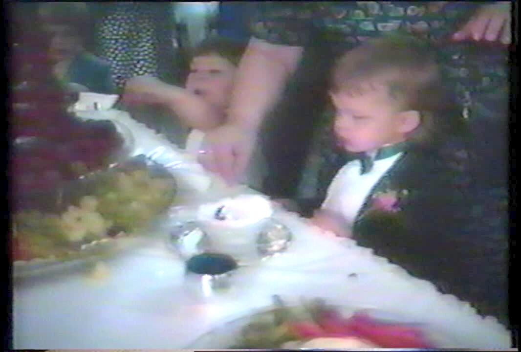 SWEET TOOTH.: Little boy licks whipped cream out of bowl with his tongue at wedding.