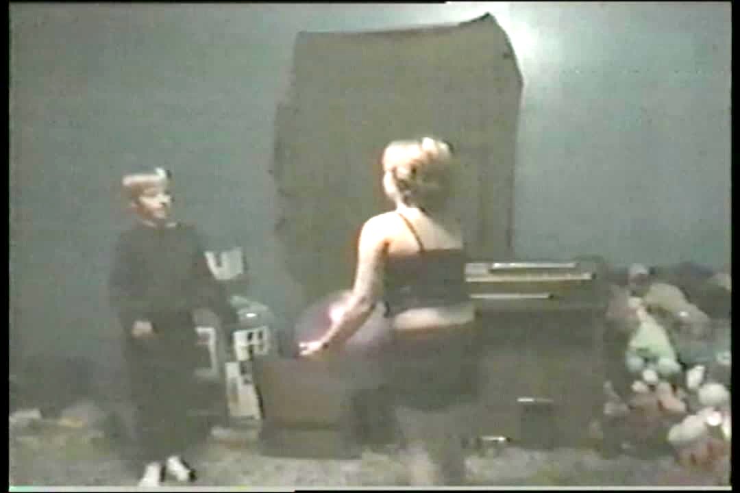 Woman wearing US / American flag bikini sits on a plastic serving cart / table and tries to ride it but it breaks / collapses and she falls down. with recovery . Bathing suit, swimsuit. Patio / porch.