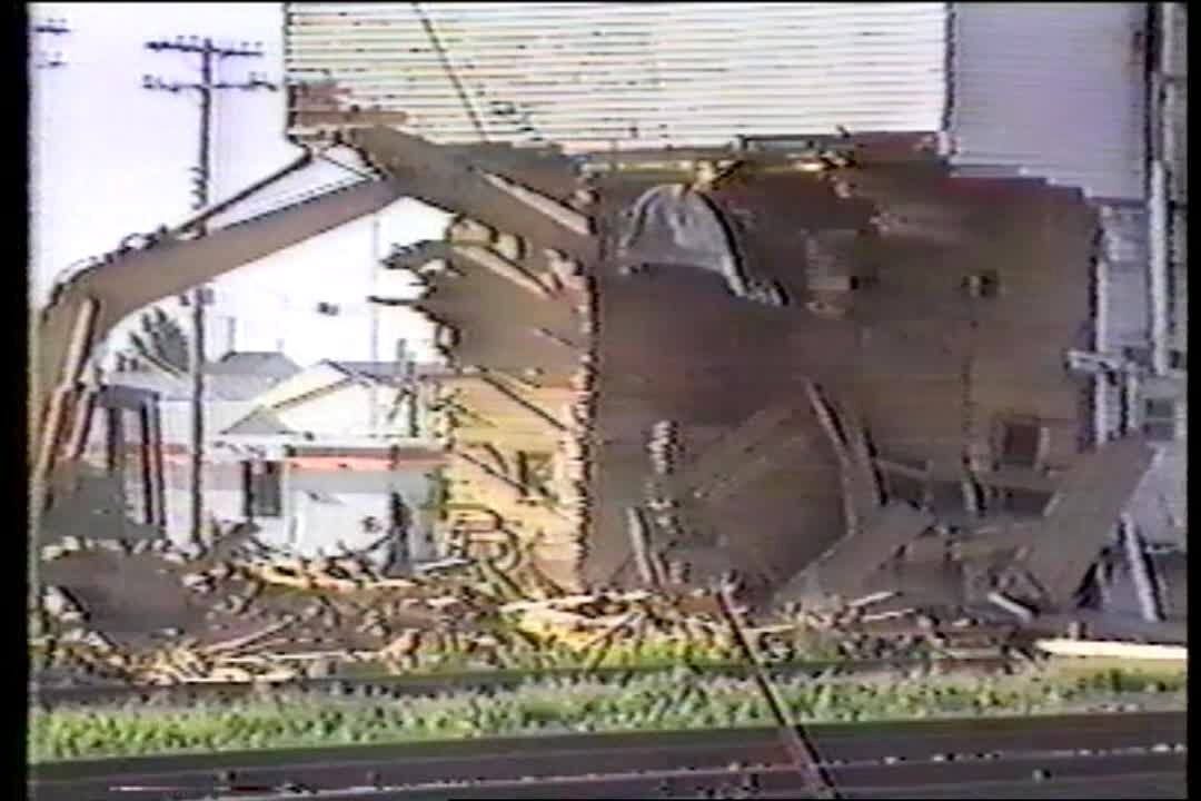 House / building / silo being torn apart falls down on tractor while truck is working. See tractor tipping over before smoke and dust covers everything. Home repair, construction, demolition.