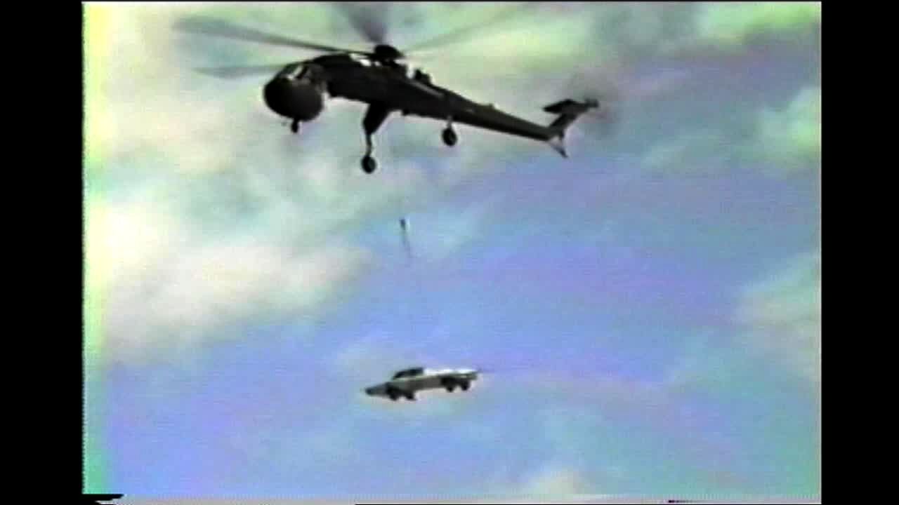 A man uses a pulley on the ceiling to lift a Jeep's hard shell roof. The ceiling breaks, the pulley falls and his young daughter says "epic fail."
