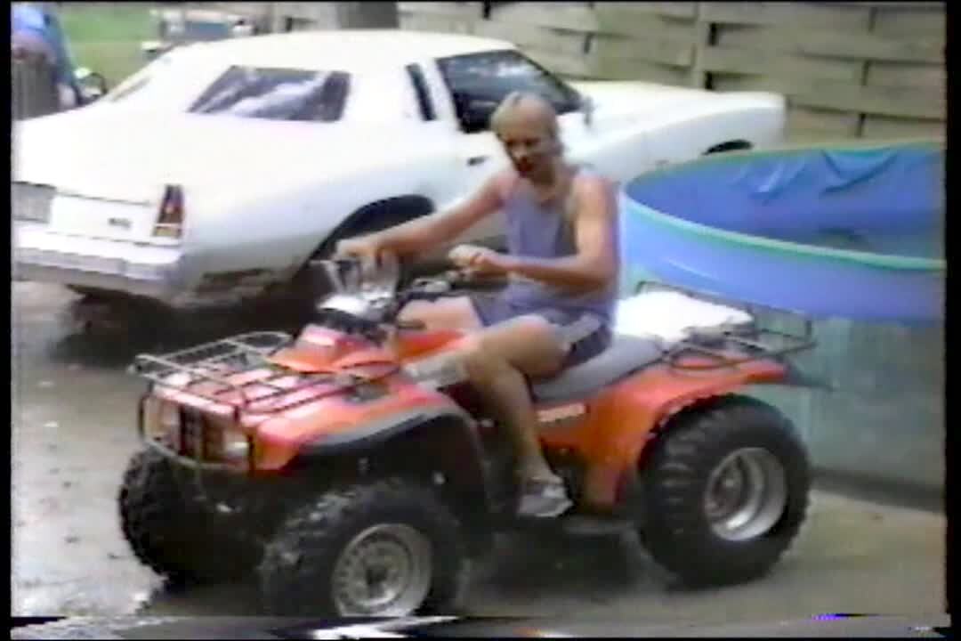 Summertime Bonehead. Man drives tractor backwards into pool. (montage)