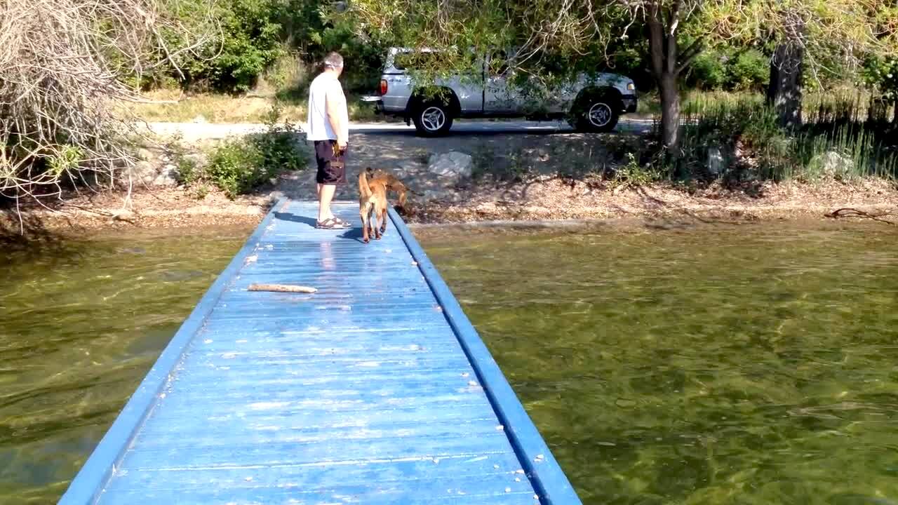 "Fido Fetch Fail" Two dogs run down a dock with a man outdoors, but stop suddenly and run back when the man throws the stick out into the water.