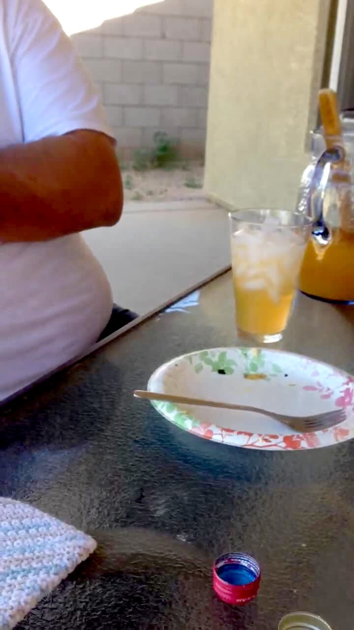 A Pomeranian dog struggles to get a clip off of the back of her neck indoors, amusing the man behind the camera and a woman off camera.