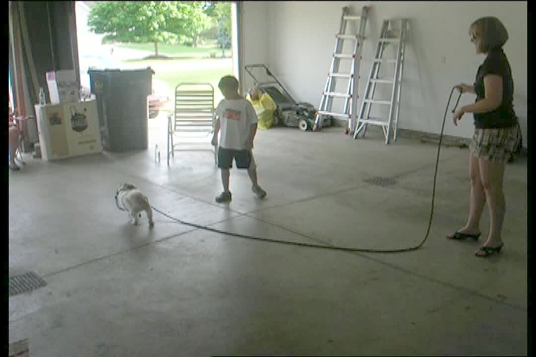 Small white dog has the end of a jump rope in its mouth, woman holds other end. Young boy & girl jump rope in the middle. Dark video.