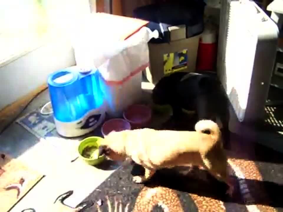 Small black dog & small brown dog eat food out of separate doggy bowls & repeatedly switch off.