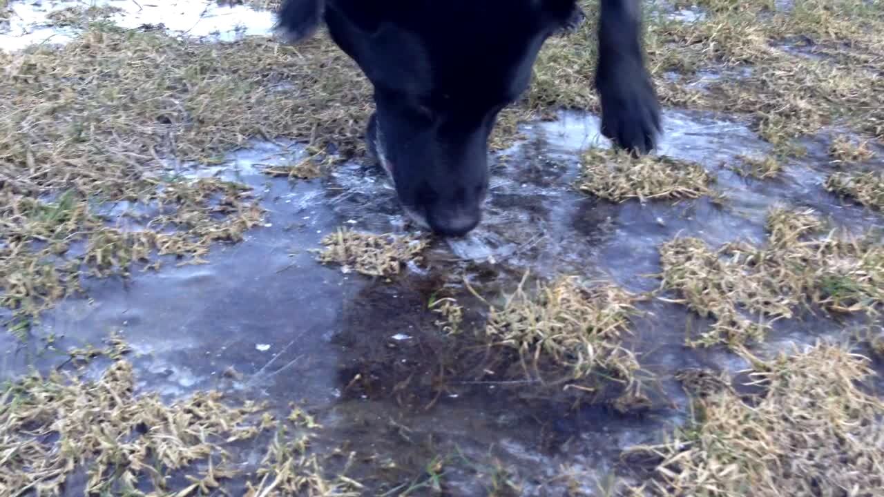A black retriever dog snarls while biting at a frozen over puddle outdoors.