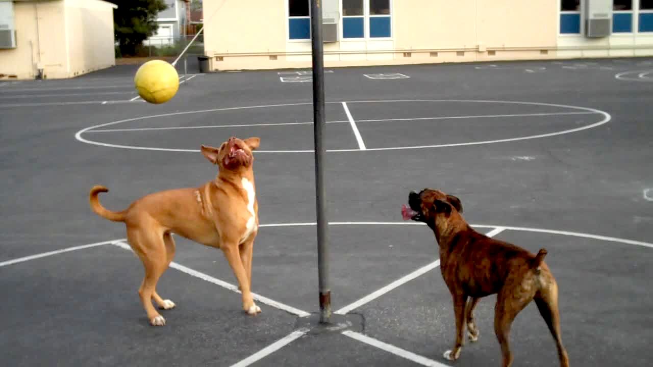 "Dog's Best Friend" Lab dog jumps on boy in yard while boy tries to get a basketball that has gone over the fence. The dog tries to hump the boy vigorously.